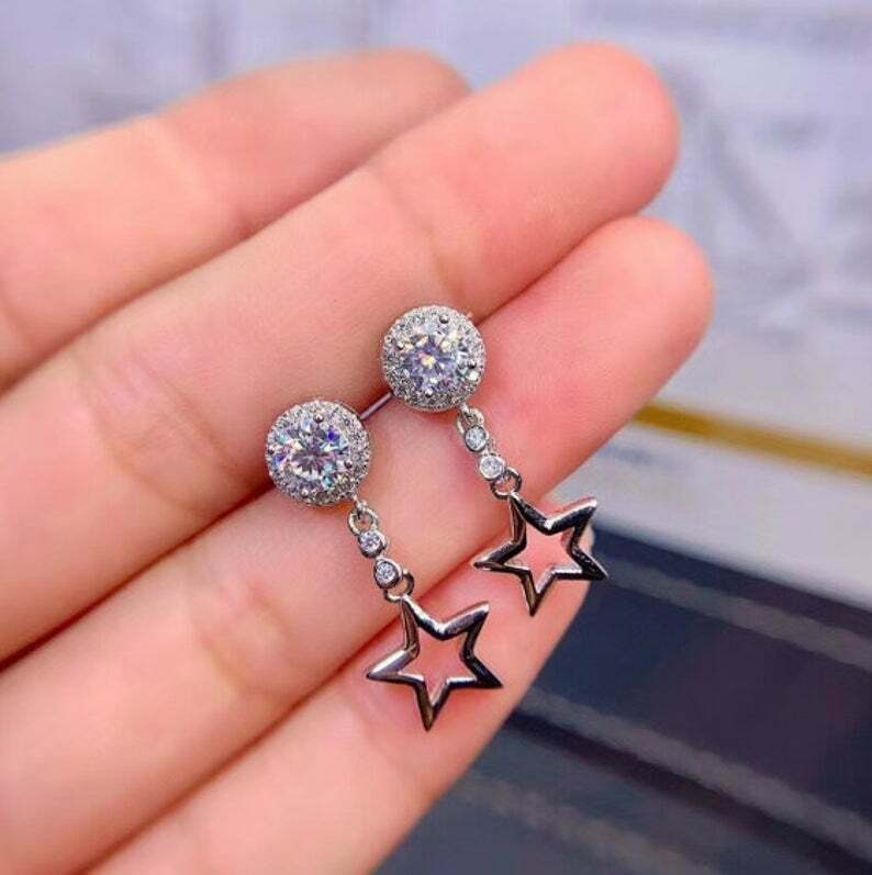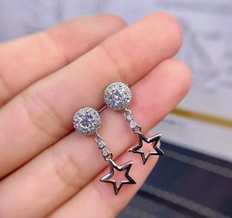 1.7ct Drop Earrings Round Cut Diamond Star Design Long 14k White Gold Finish