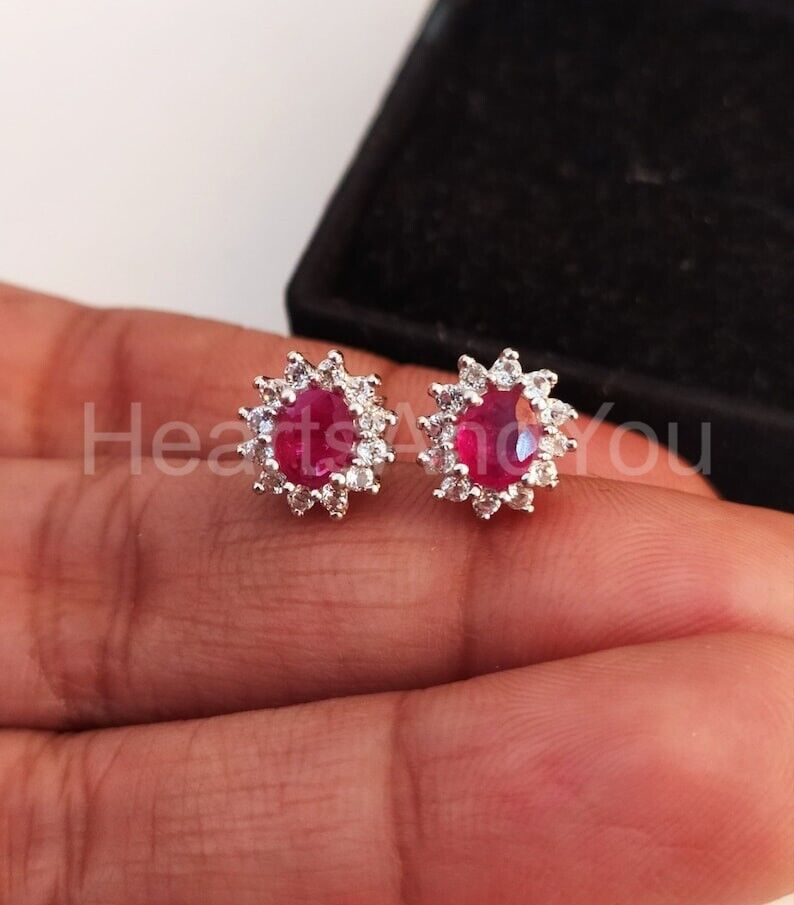 1ct Oval Cut Simulated Pink Ruby Floral Halo Stud Earrings 14k White Gold Plated