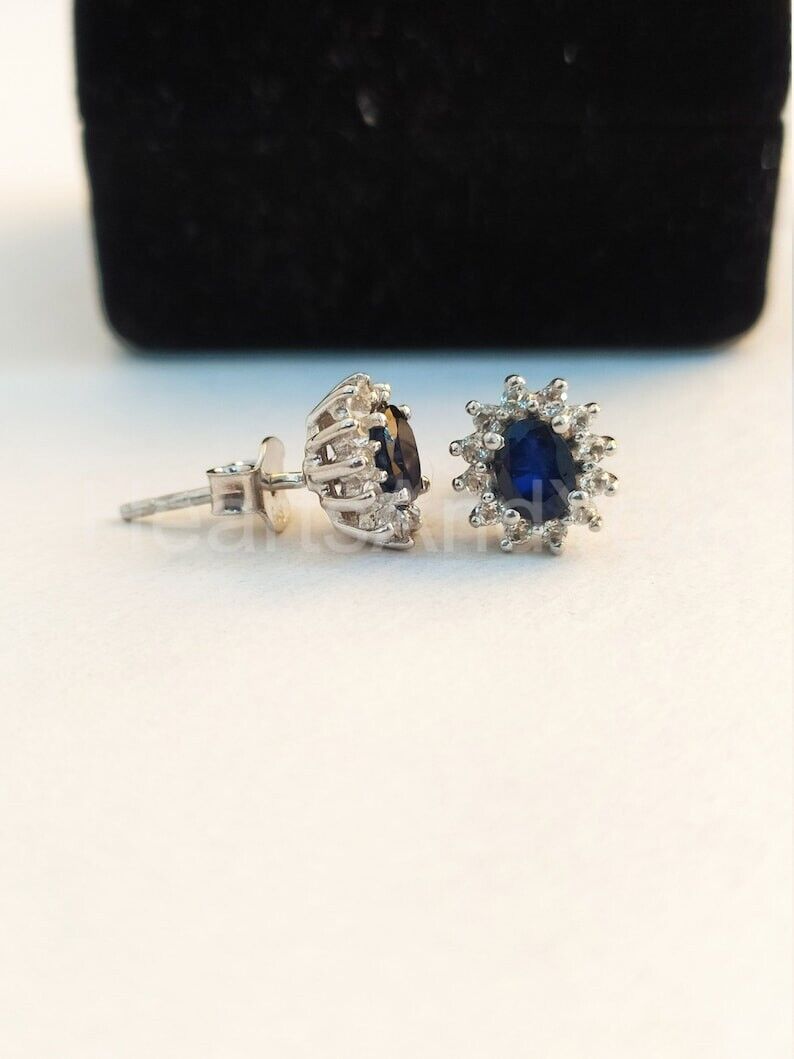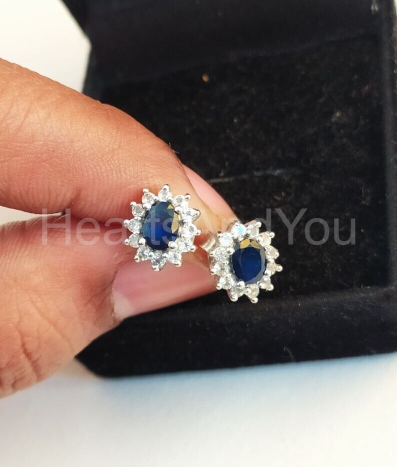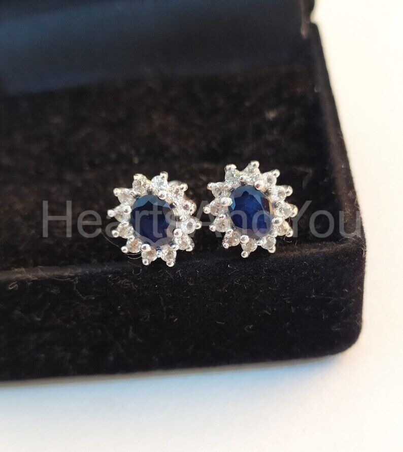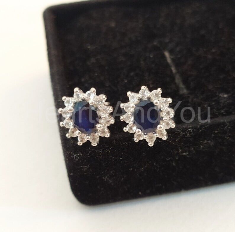 1ct Oval Cut Simulated Blue Sapphire Floral Halo Stud Earrings 14k White Gold Plated