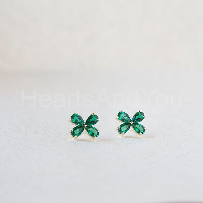 1ct Pear Cut Simulated Green Emerald Flower Stud Earrings 14k Yellow Gold Plated