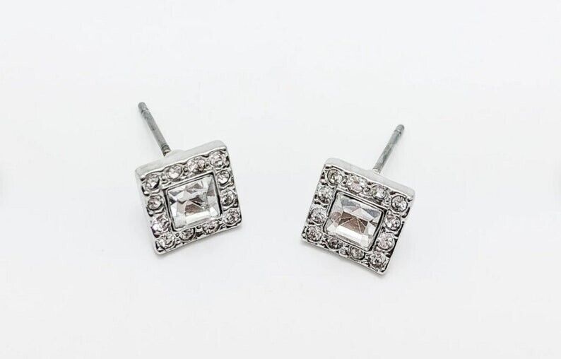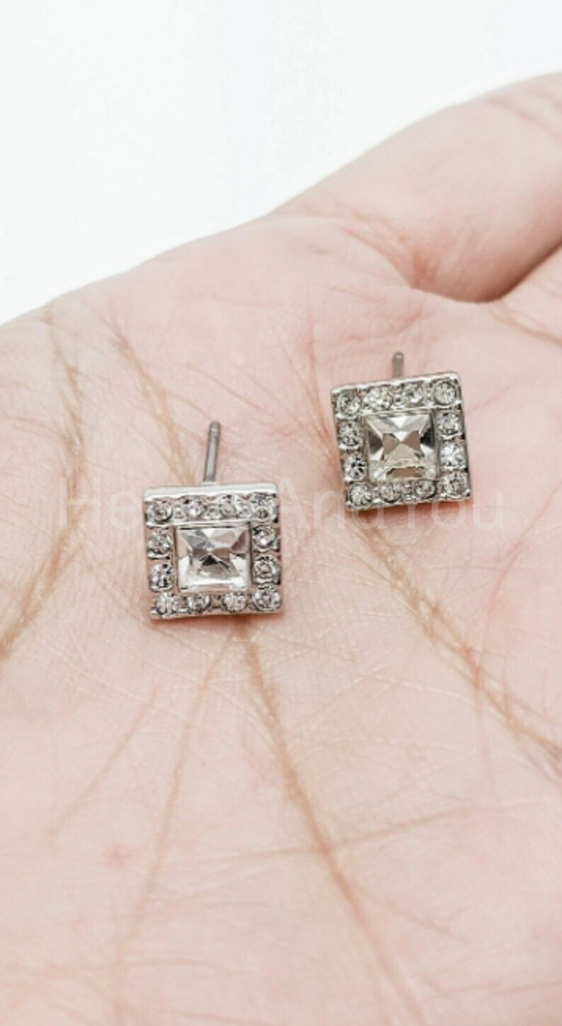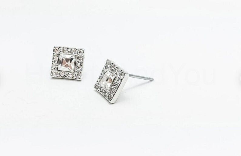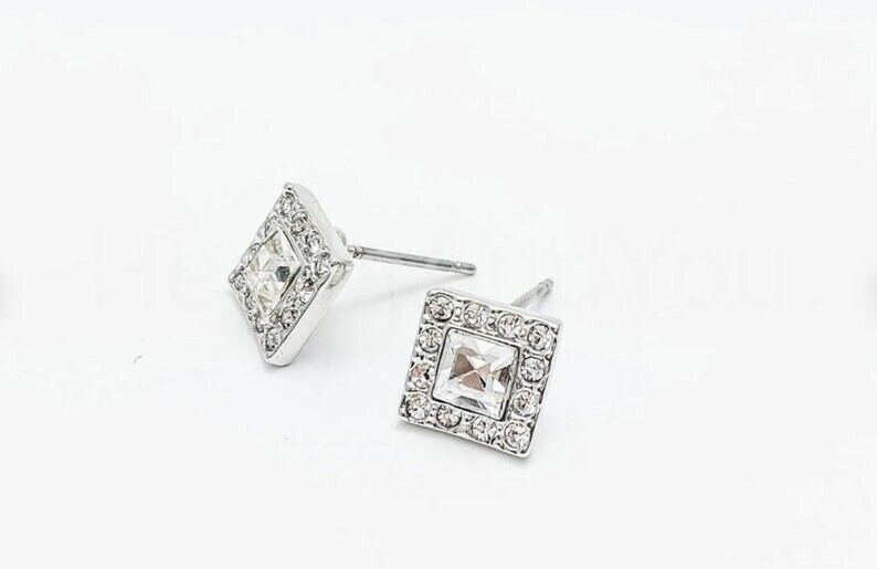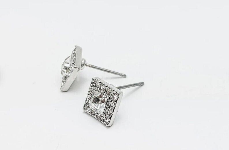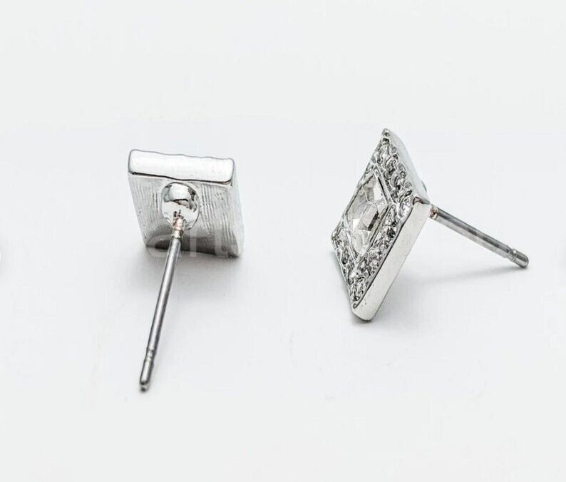 1ct Princess Cut Simulated Diamond Square Halo Tile Stud Earrings 14k White Gold Plated