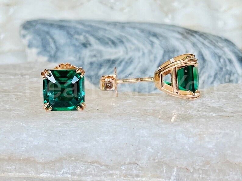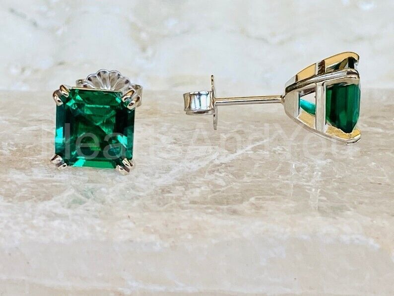 2ct Asscher Simulated Emerald Dual Prong Stud Earrings 14k White Gold Plated