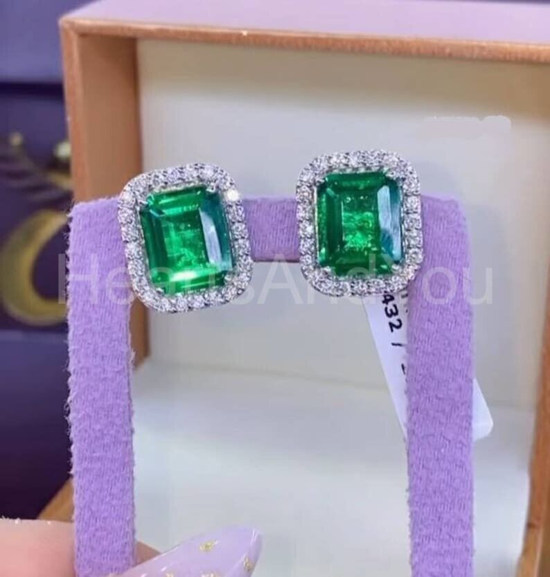 2ct Green Emerald Cut Simulated Halo Stud Earrings 14k White Gold Plated