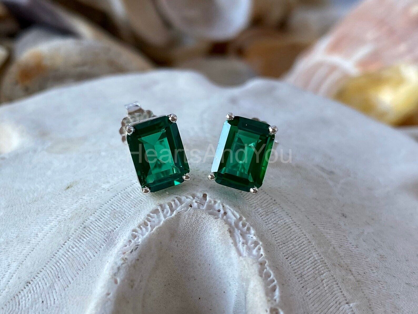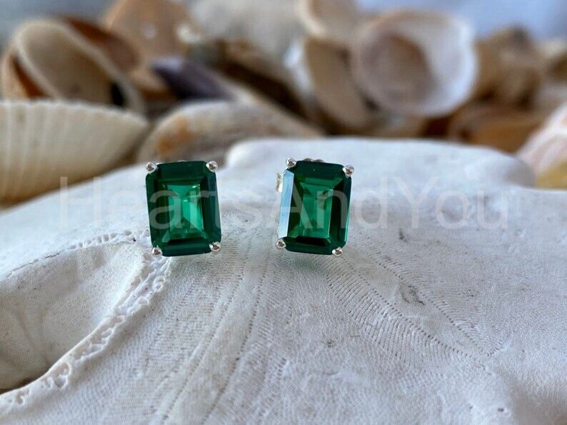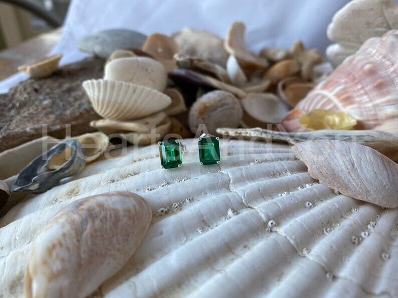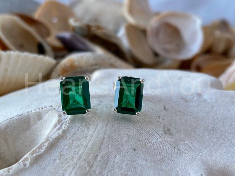 2ct Green Emerald Cut Simulated Solitaire Stud Earrings 14k White Gold Plated