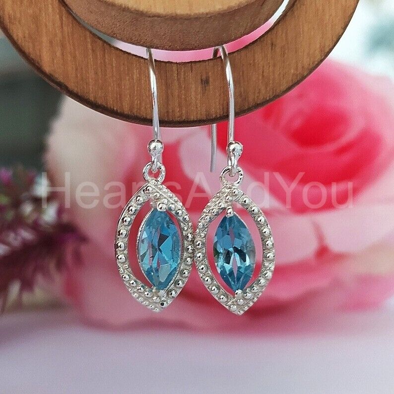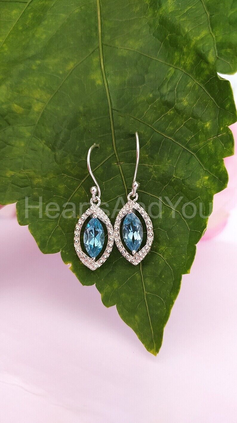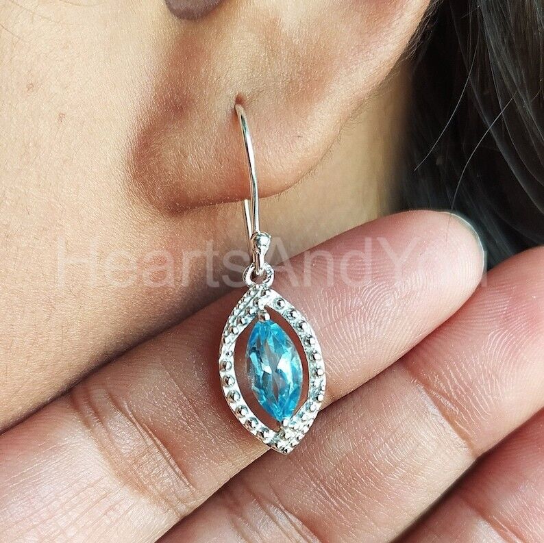 2ct Marquise Cut Simulated Blue Aquamarine Halo Dangle Earrings 14k White Gold Plated