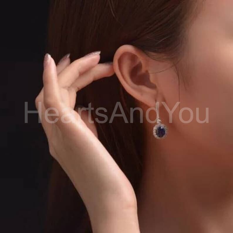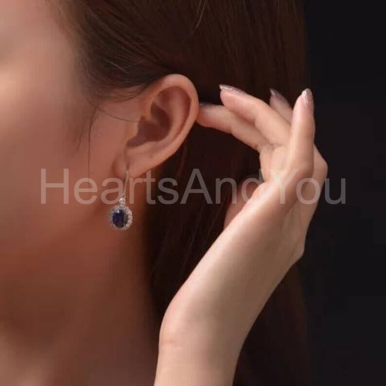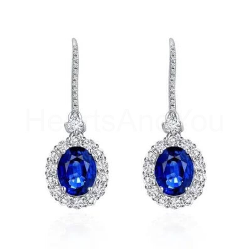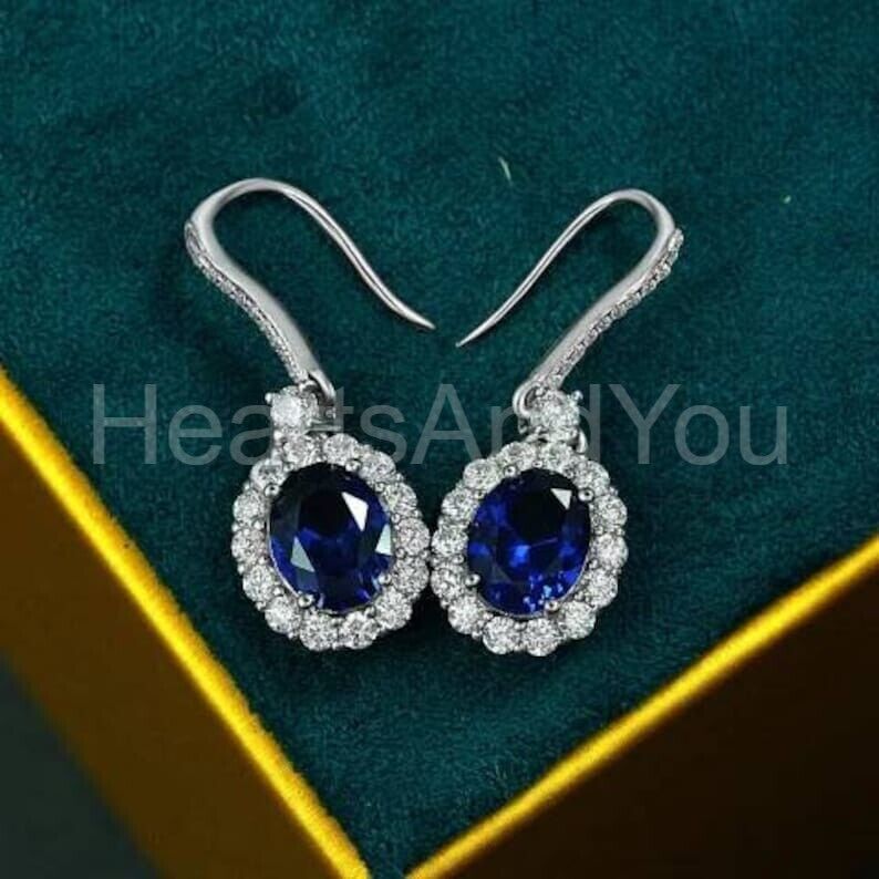 2ct Oval Simulated Sapphire Halo Fish Hook Drop Earrings 14k White Gold Plated