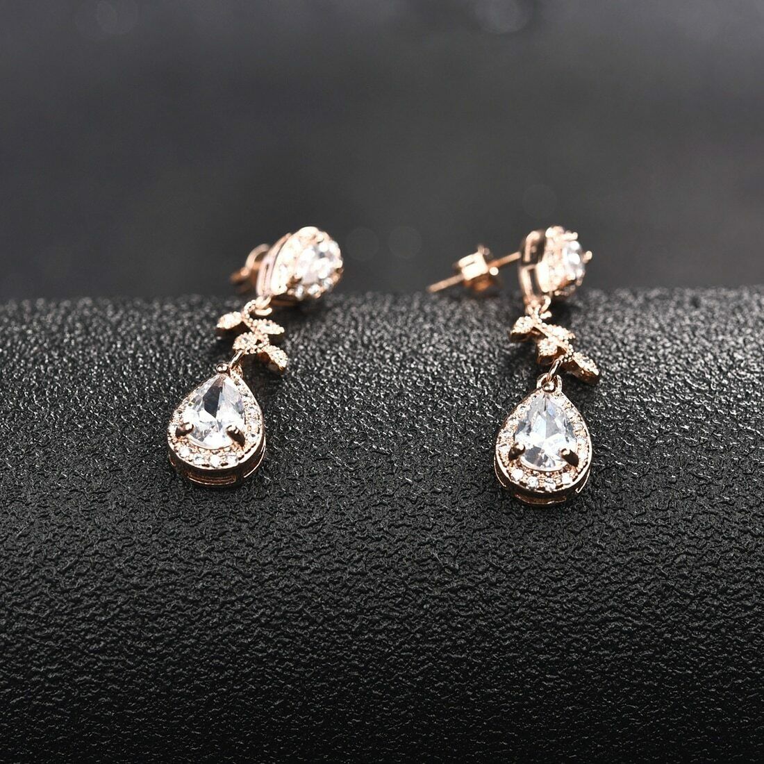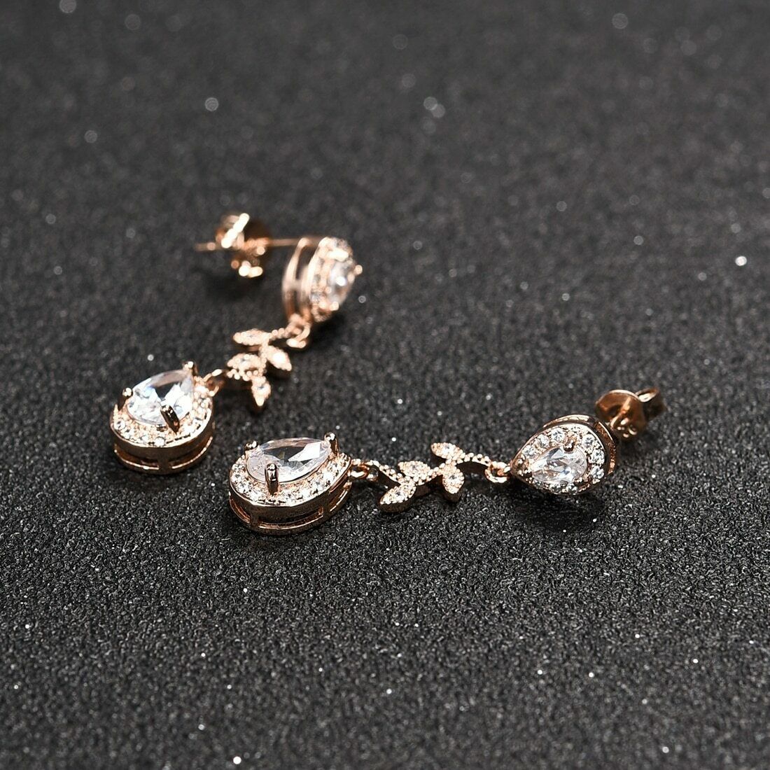 2ct Pear Cut VVS1D Diamond Halo Leaf Design Drop Earrings 14k Rose Gold Finish