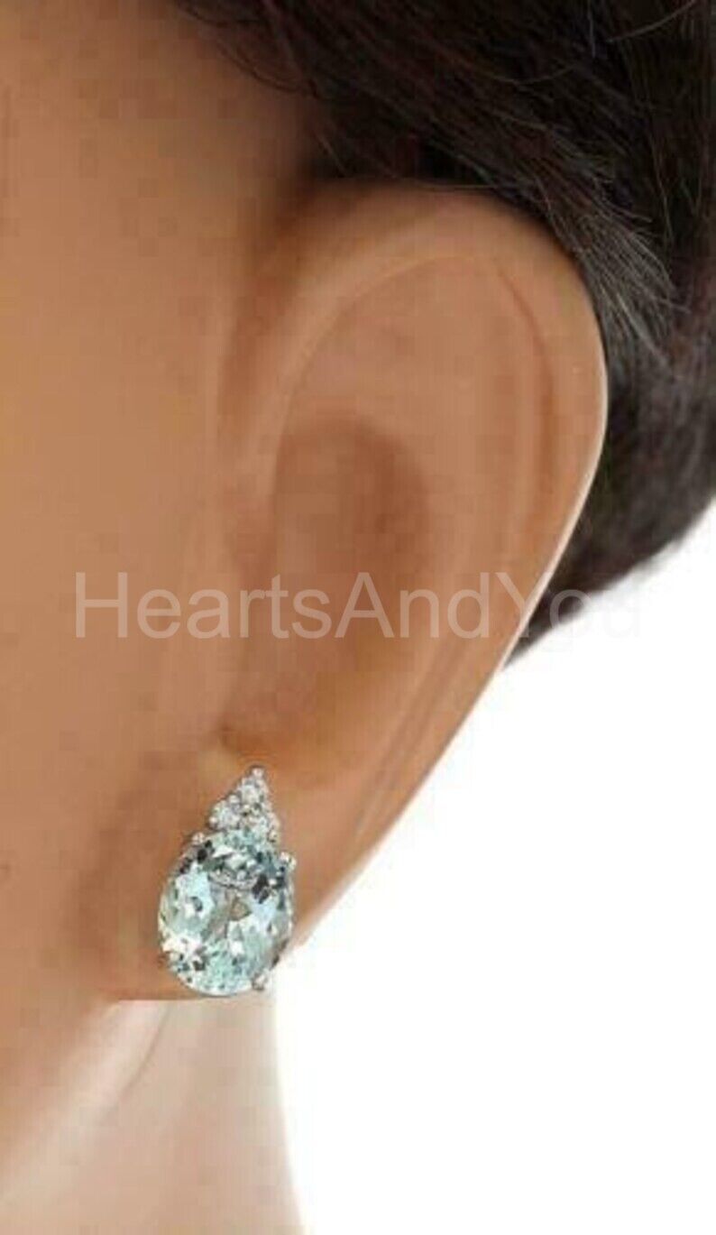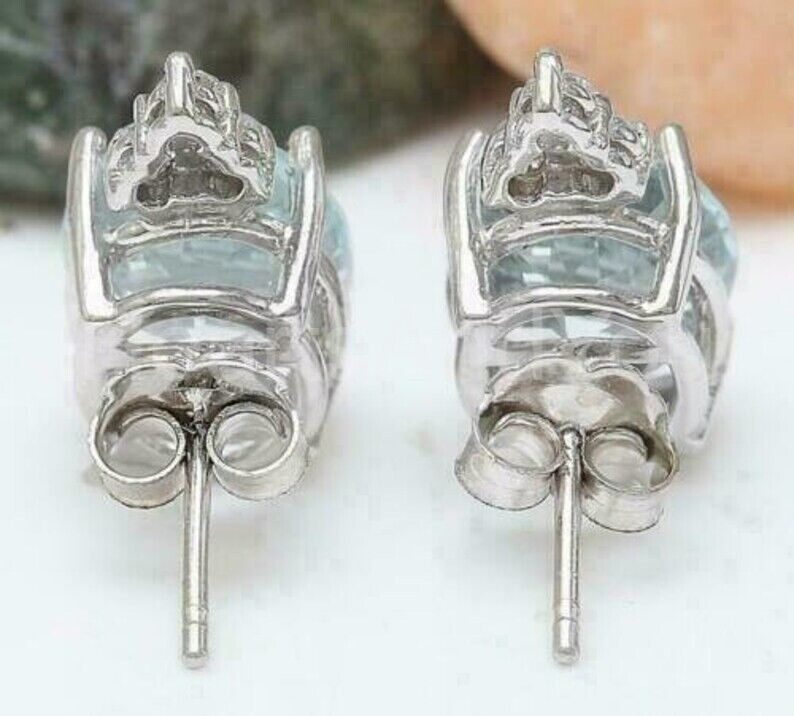 3ct Oval Cut Simulated Blue Aquamarine Crown Stud Earrings 14k White Gold Plated