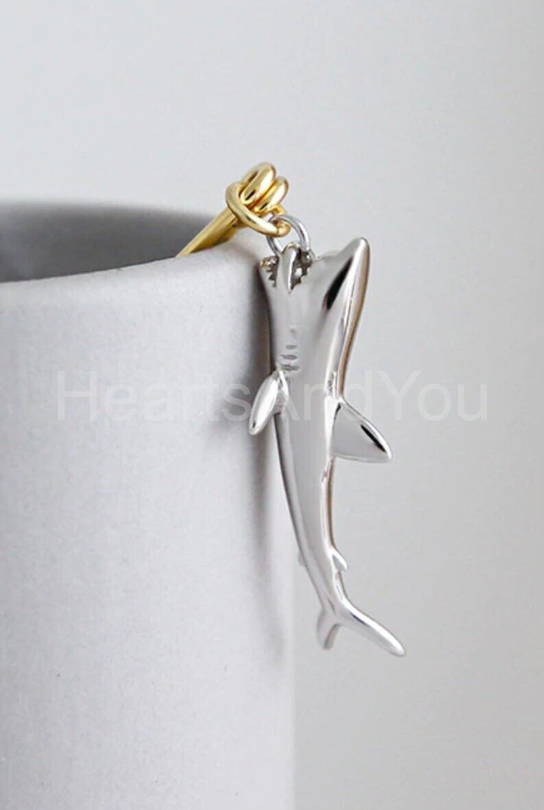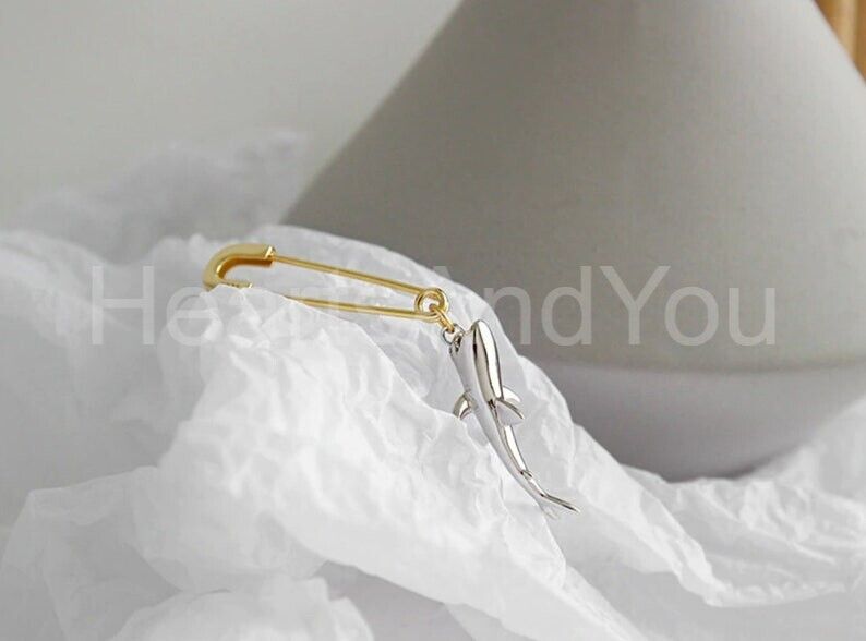 Dainty Single Shark Safety Pin Drop Dangle Earrings 14k Dual Gold Plated