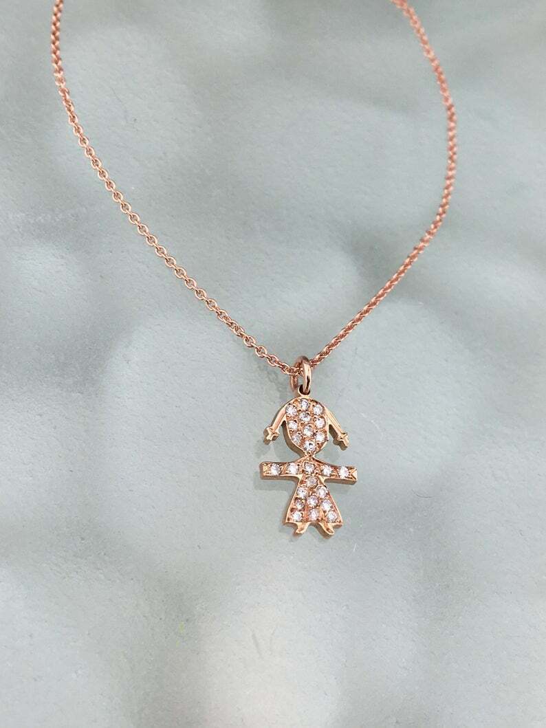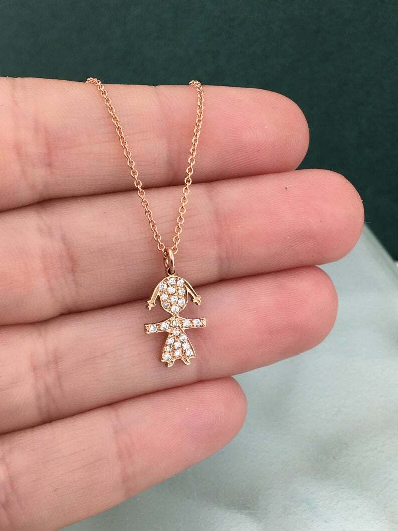 0.7ct Round Cut Diamond Pendant with Chain Girl Kid Design 14k Rose Gold Finish