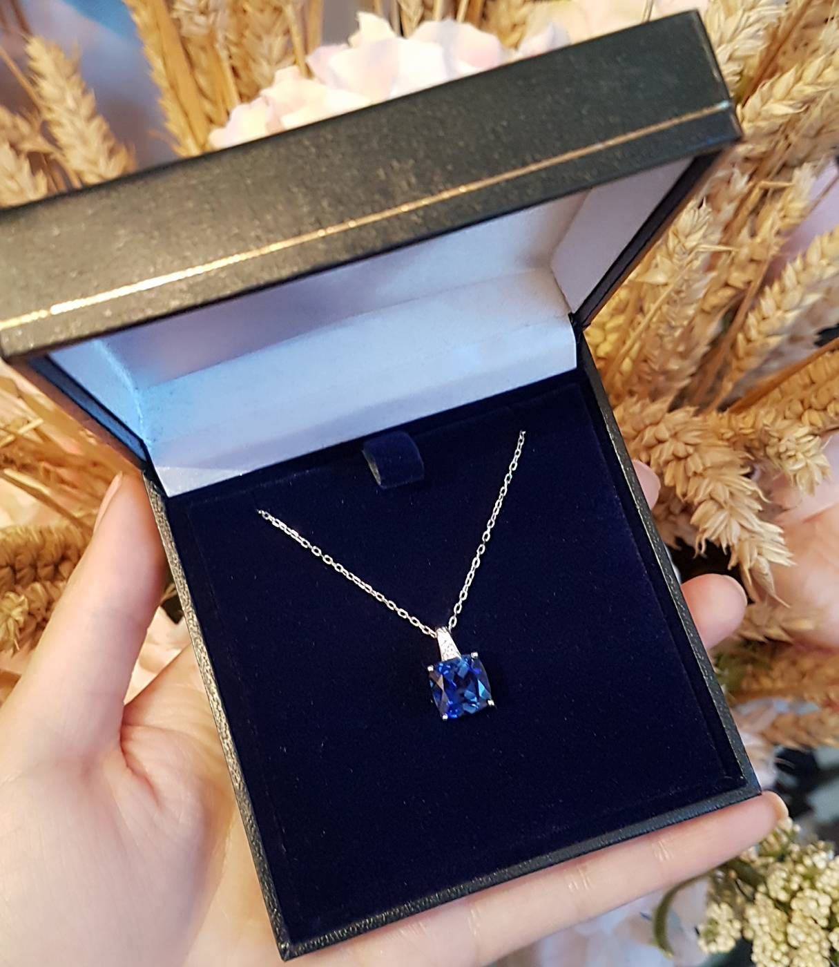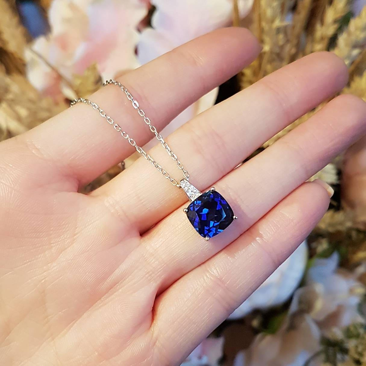 2ct Cushion Cut Blue Sapphire Solitaire Pendant with Chain 14k White Gold Finish