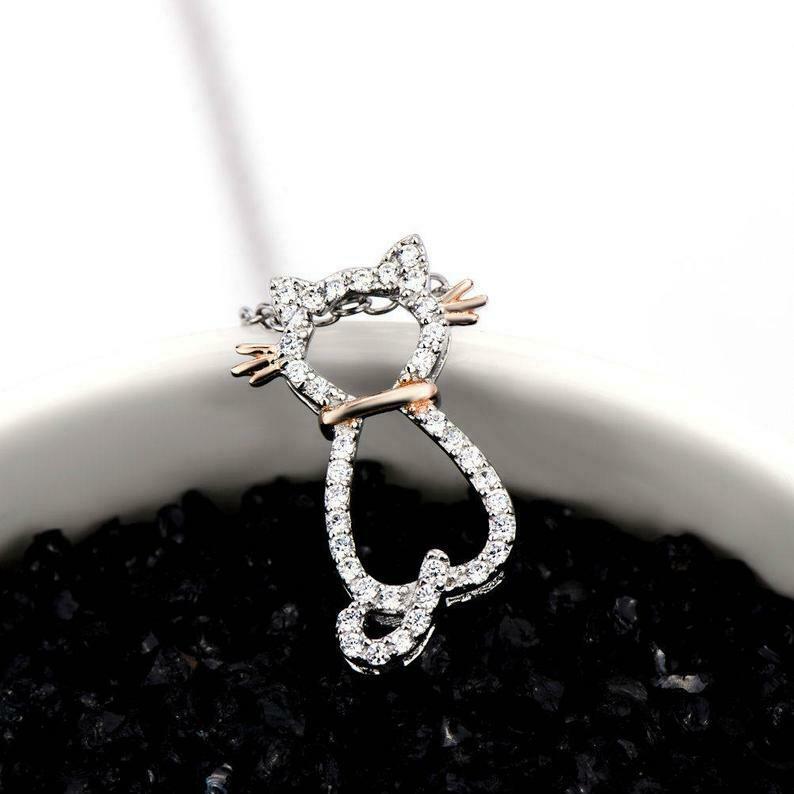 2ct Round Cut VVS1D Diamond Pendant Chain Kitten Cat Design 14k Dual Gold Finish