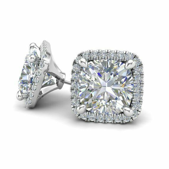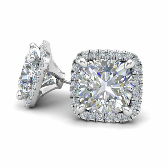 4Ct Cushion Cut VVS1D Diamond Halo Solitaire Stud Earrings 18K White Gold Finish