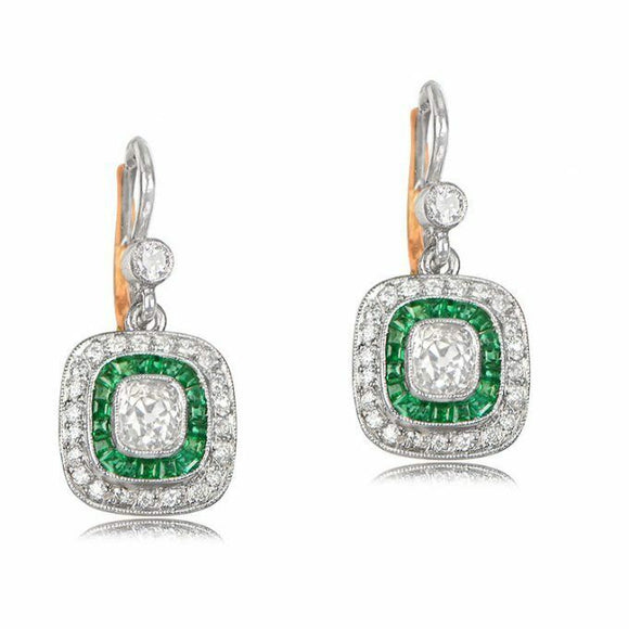 4ct Cushion Cut Diamond Green Emerald Art Deco Drop Earrings 14k White Gold Over
