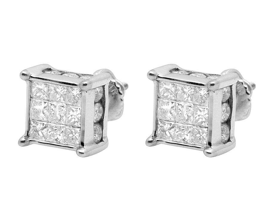 2ct Princess Cut VVS1 Diamond 3D Cube Design Stud Earrings 14k White Gold Finish