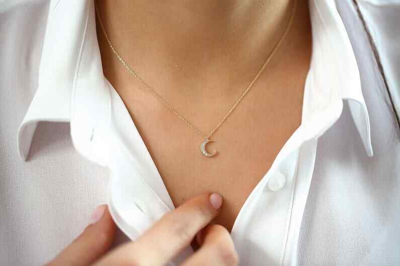 0.7ct Diamond Pendant with Chain Round Cut Crescent Moon 14k Yellow Gold Finish