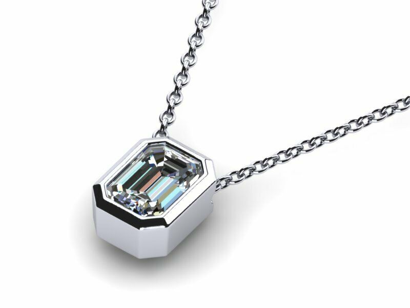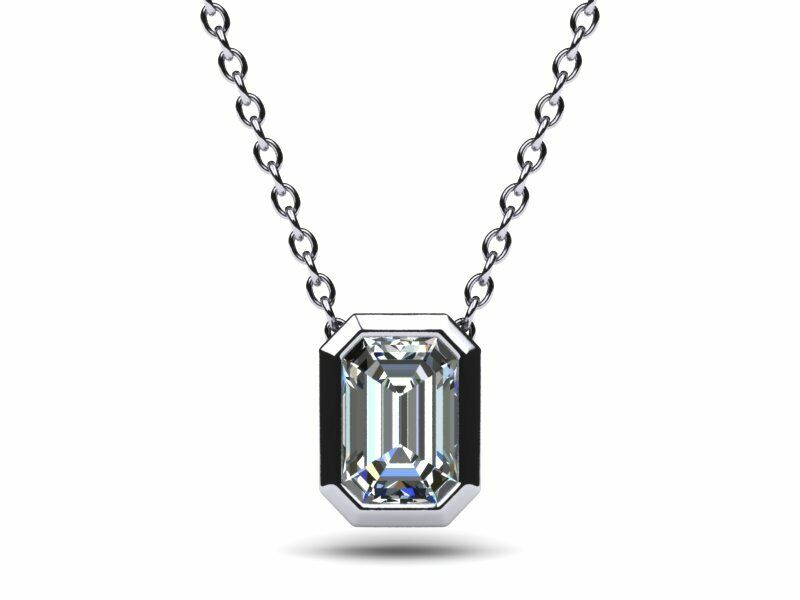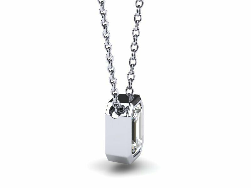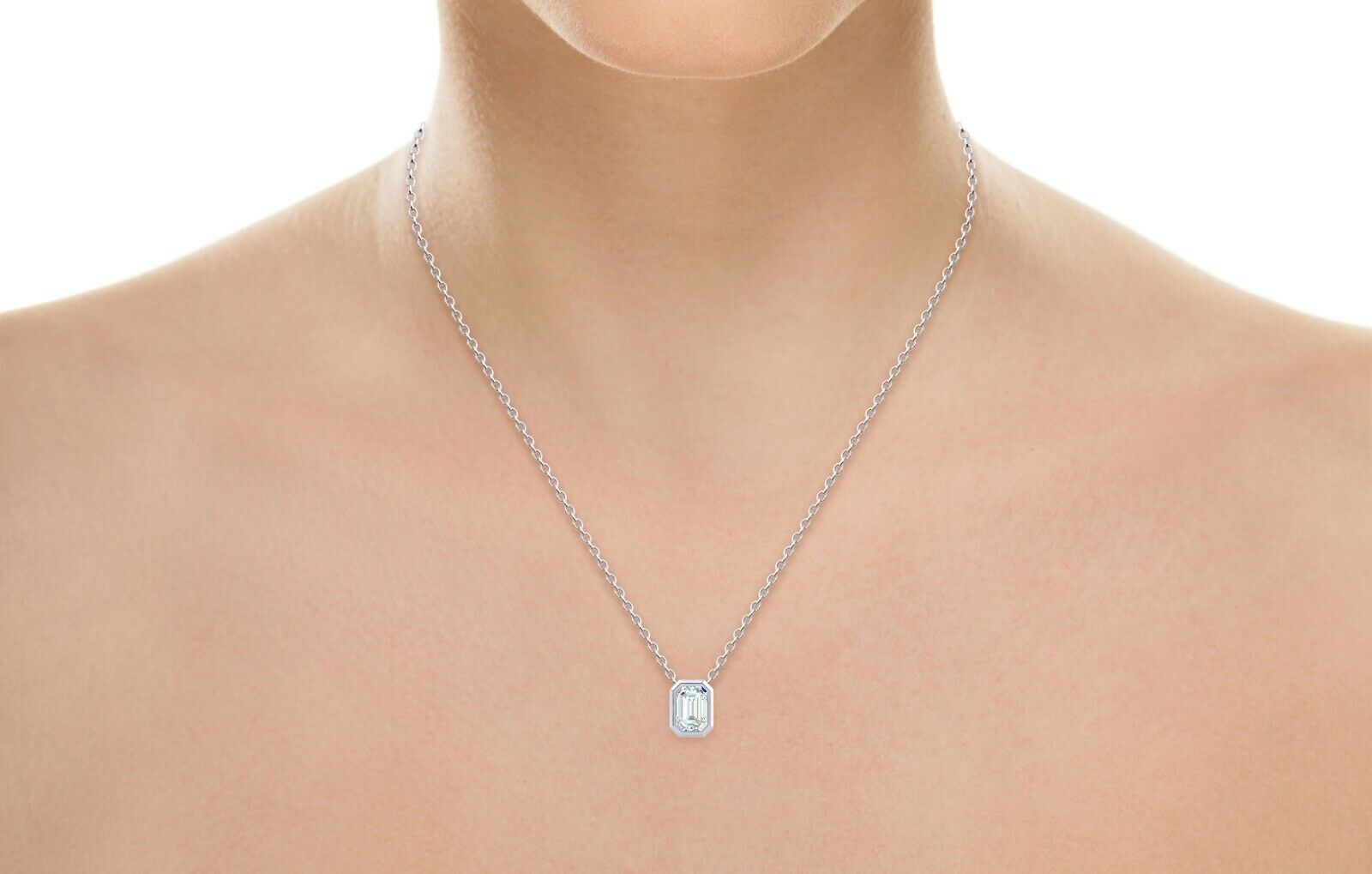 1ct Diamond Pendant with Chain Emerald Cut Bezel Set Solitaire 14k White Gold Finish