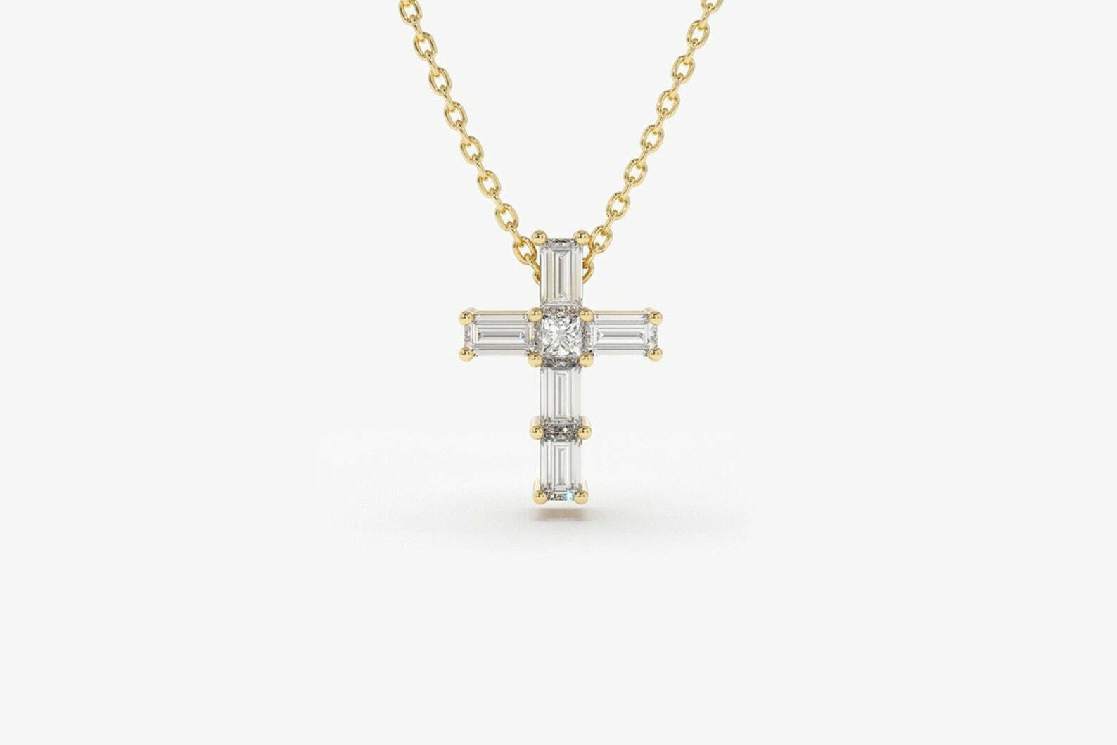 2ct Baguette Cut Diamond Jesus Cross Holy Pendant with Chain 14k YellowGold Over