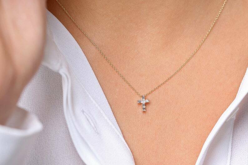 2ct Baguette Cut Diamond Jesus Cross Holy Pendant with Chain 14k Yellow Gold Over