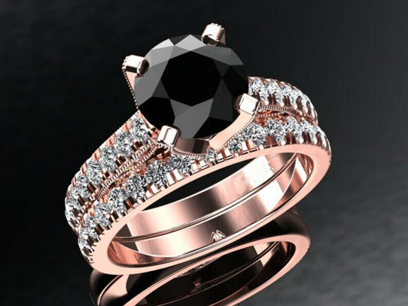 2.3ct Round Black Diamond Bridal Set Ring with Accents Band 14k Rose Gold Finish