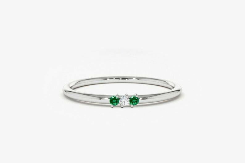0.3ct Engagement Ring Round Diamond Emerald Accent Trilogy 14k White Gold Finish