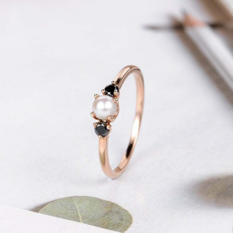 0.4ct Round Cut Black Diamond Pearl Minimalist Engagement Ring 14k RoseGold Over