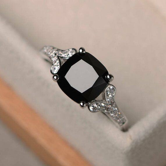 0.7ct Cushion Cut Black Diamond Solitaire Filigree Ring 14k White Gold Finish
