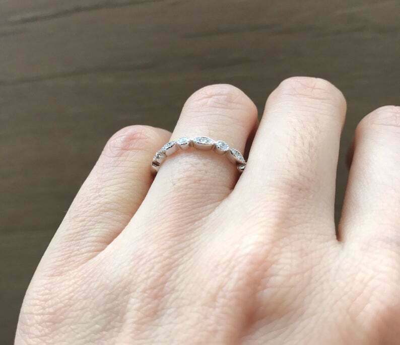 0.7ct Round Cut Diamond Wedding Band Milgrain Half Eternity 14k White Gold Finish