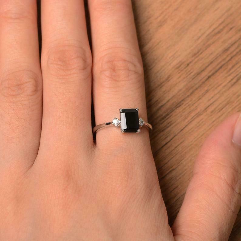 1.2ct Engagement Ring Emerald Cut Black Diamond Three Stone 14k WhiteGold Finish