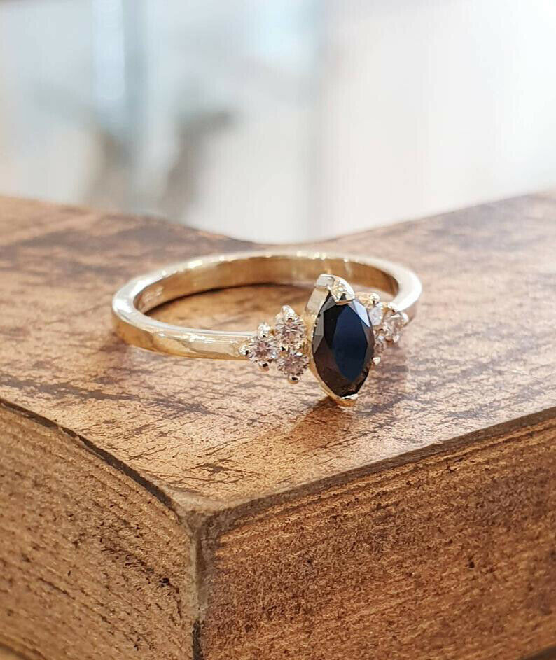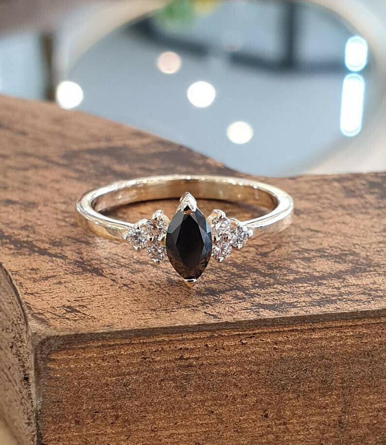 1.2ct Marquise Cut Black Diamond Round Accent Solitaire Ring 14k Yellow Gold Over