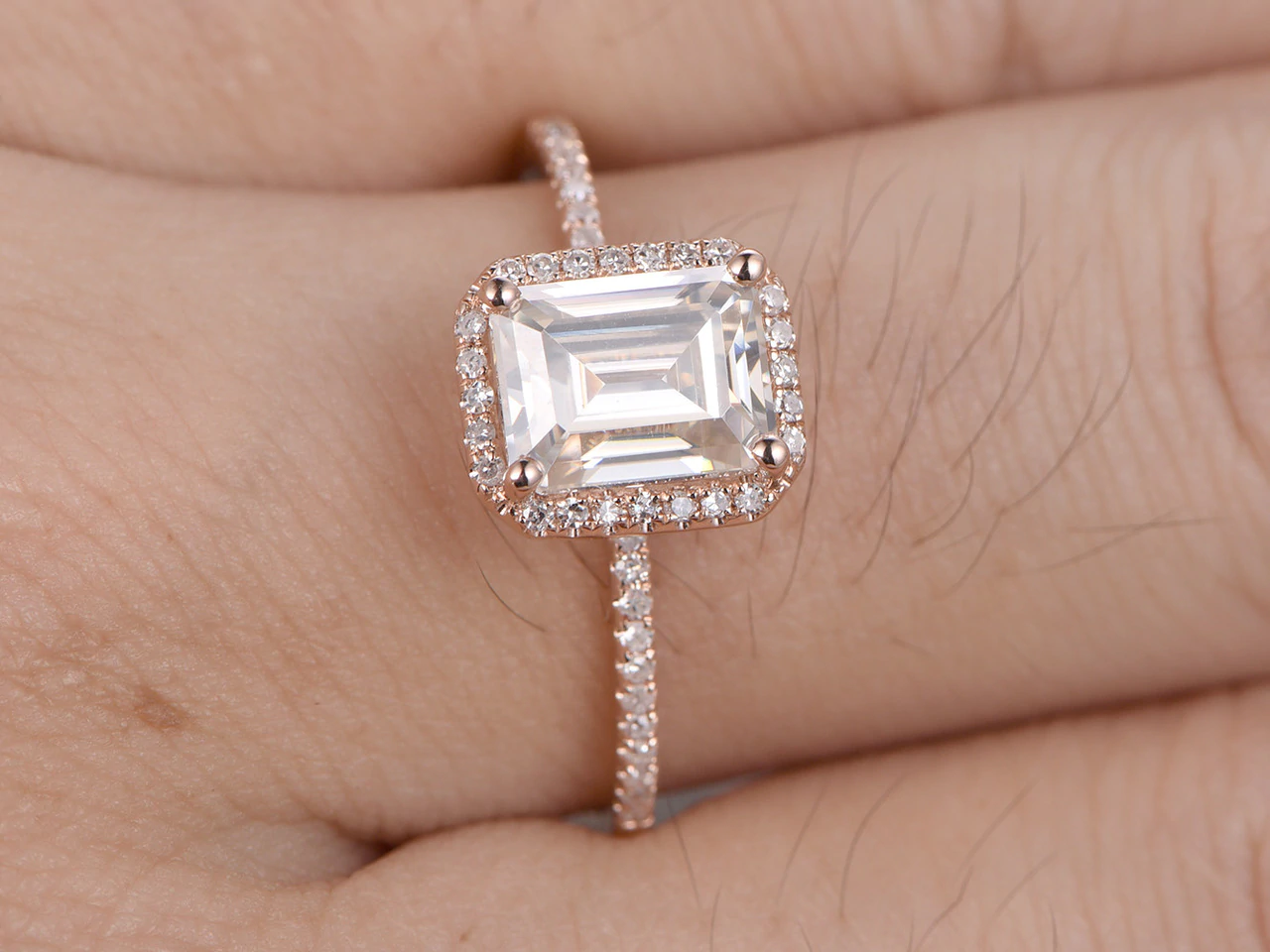 1.3ct Emerald Cut Diamond Halo Solitaire with Accents Ring 14k Rose Gold Finish