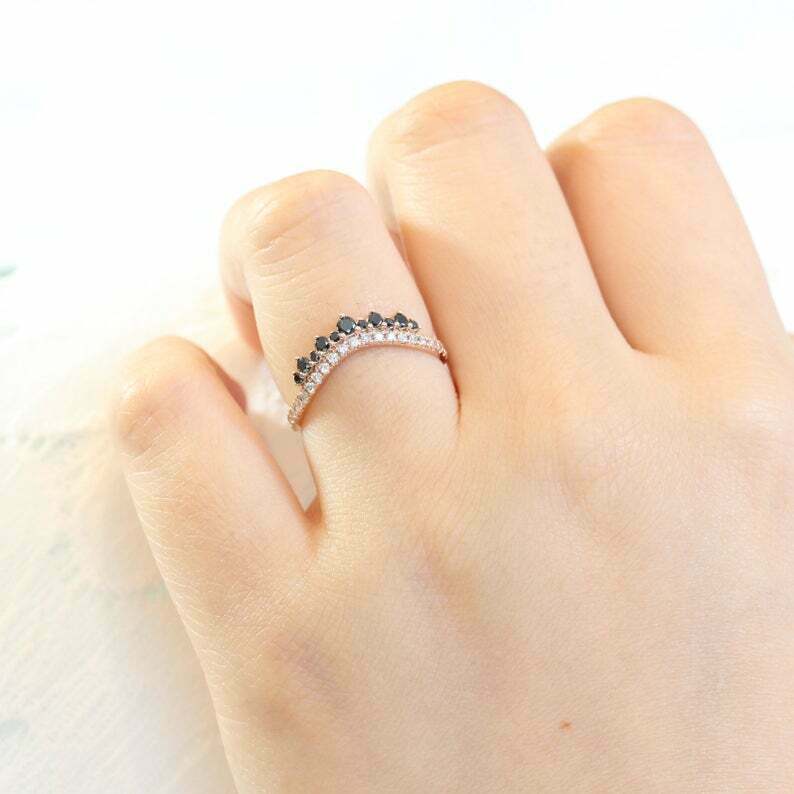 1.4ct Round Cut White Black Diamond Wedding Band Curved Crown 14k Rose Gold Over