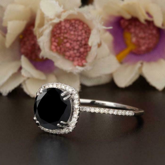 1.5ct Cushion Black Diamond Engagement Ring 14k White Gold Finish Halo Stackable