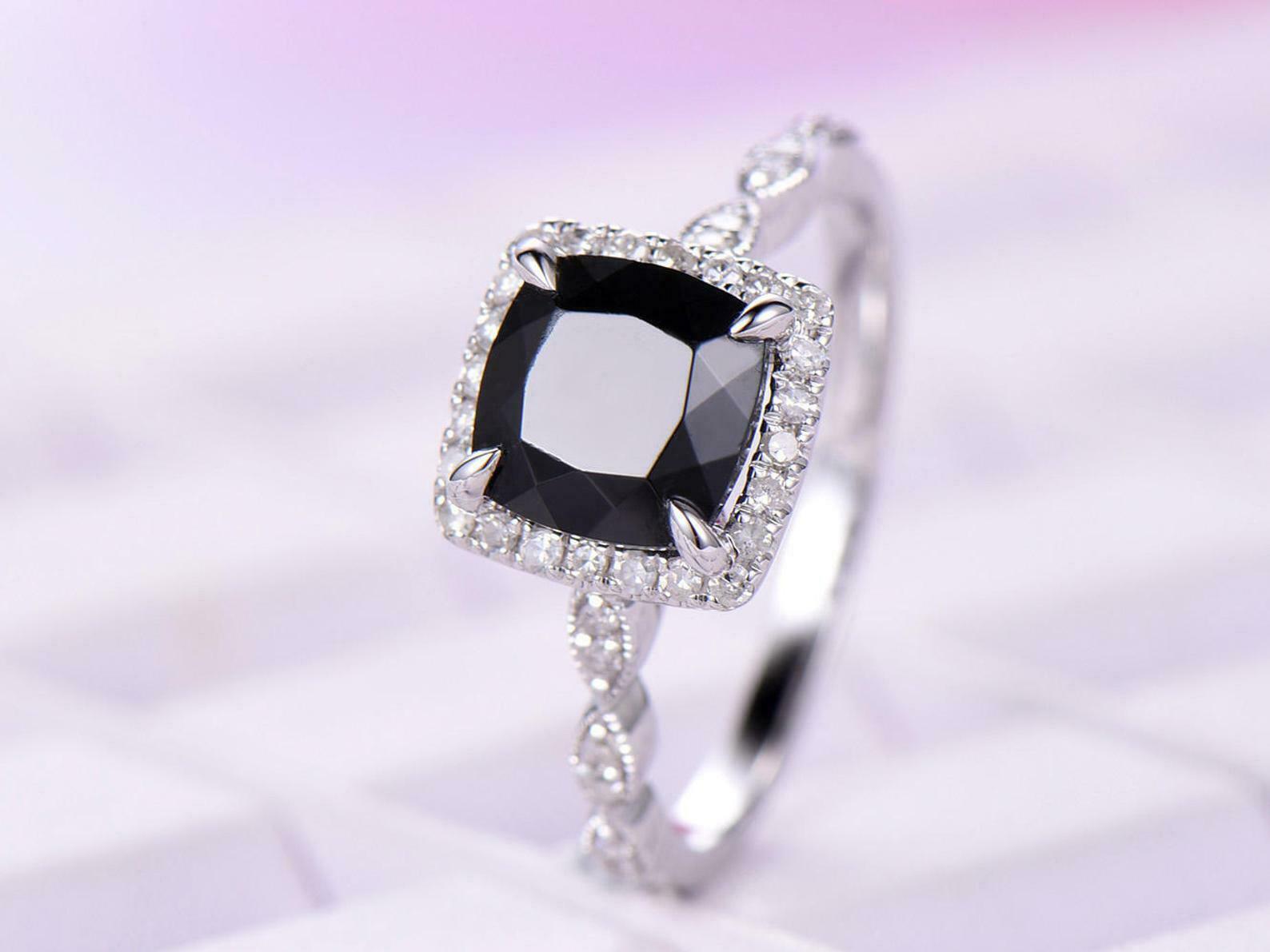 1.5ct Cushion Cut Black Diamond Halo Engagement Ring with Accent 14k White Gold Over