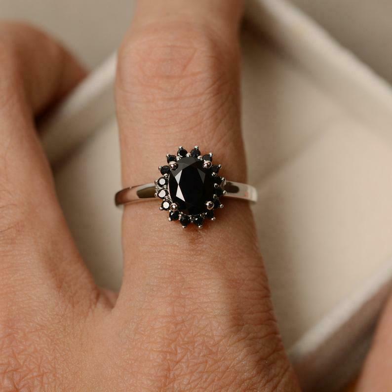 1.5ct Engagement Ring Oval Cut Black Diamond Floral Halo 14k White Gold Finish