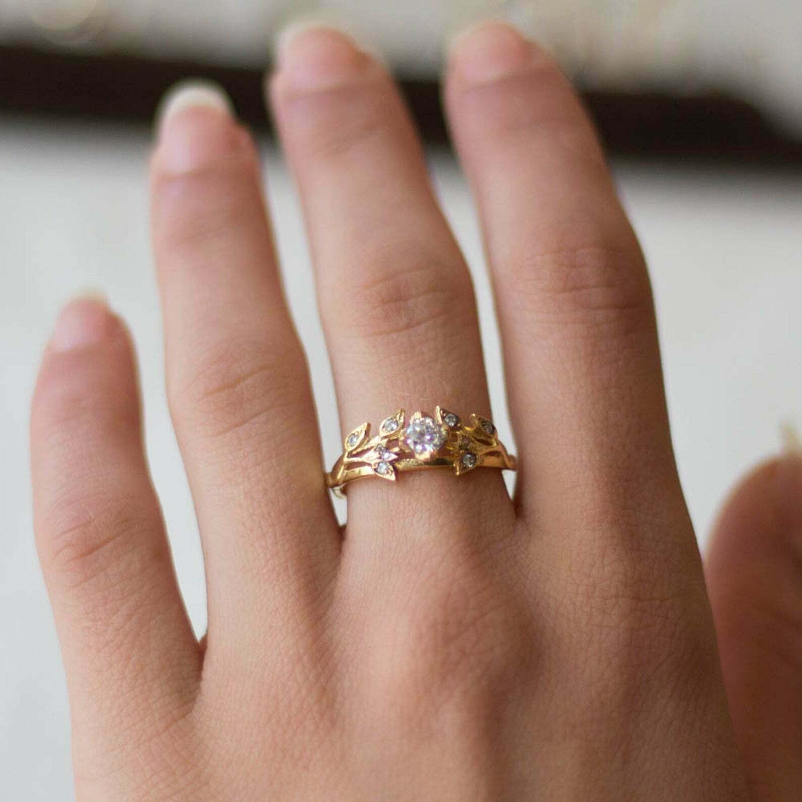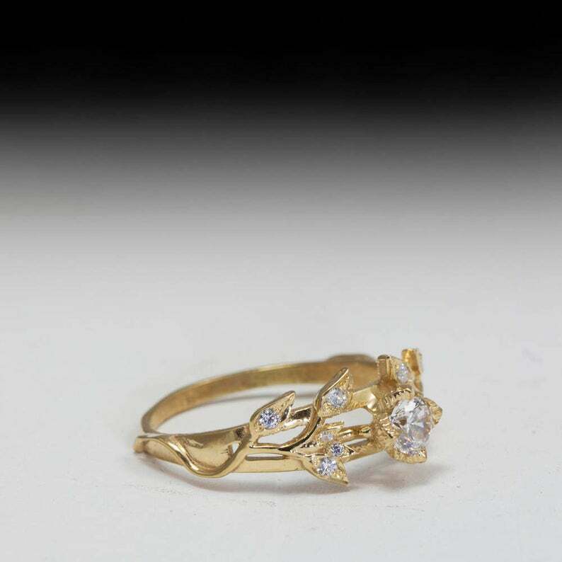 1.5ct Engagement Ring Round Cut Diamond Floral Leaf Design 14k Yellow Gold Finish