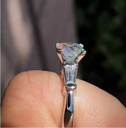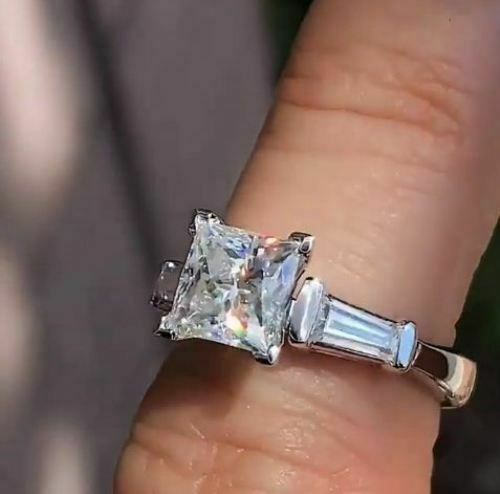 1.5Ct Princess Cut Diamond Solitaire Ring 14K White Gold Finish Baguette Accents