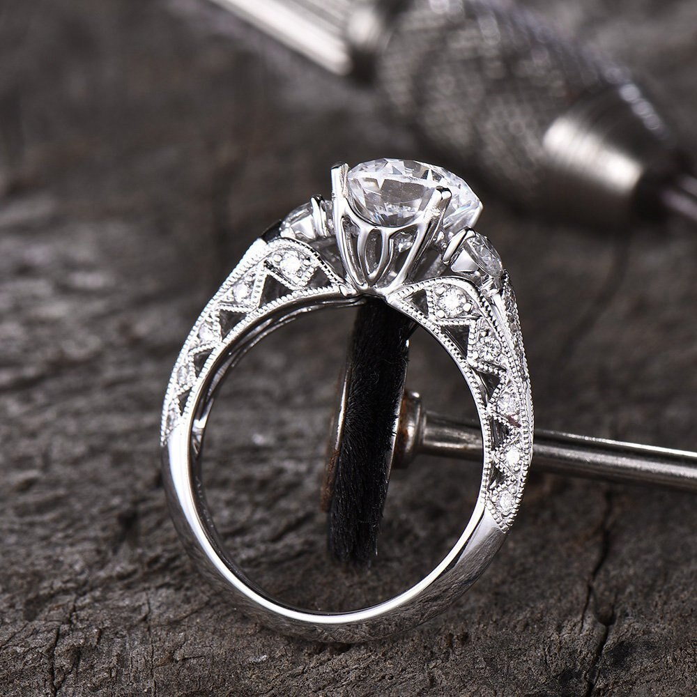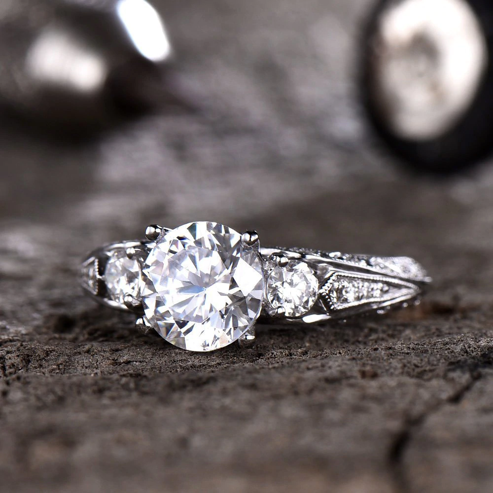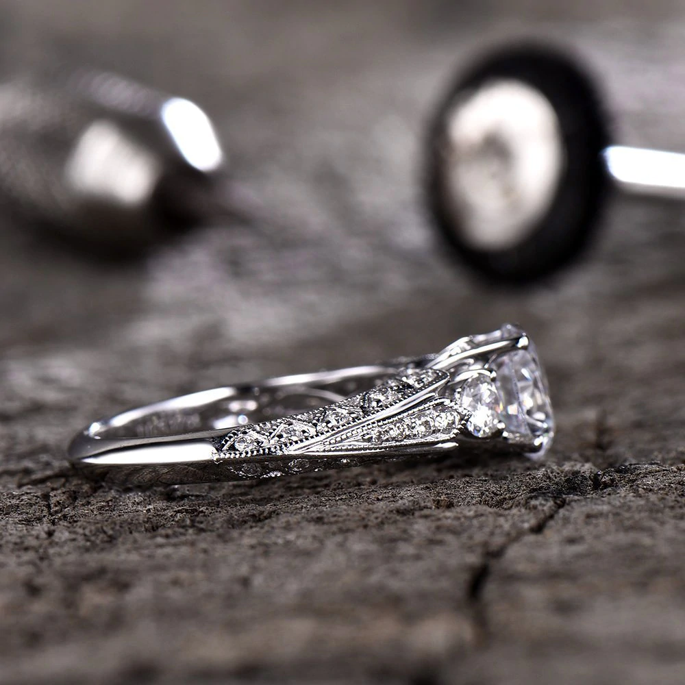 1.5ct Round Cut Diamond Engagement Ring Vintage Milgrain 14k White Gold Finish