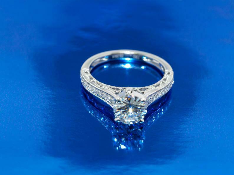 1.5ct Round Cut Diamond Solitaire with Accent Milgrain Ring 14k WhiteGold Finish