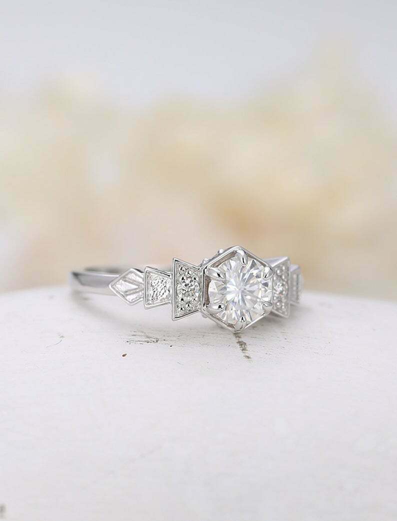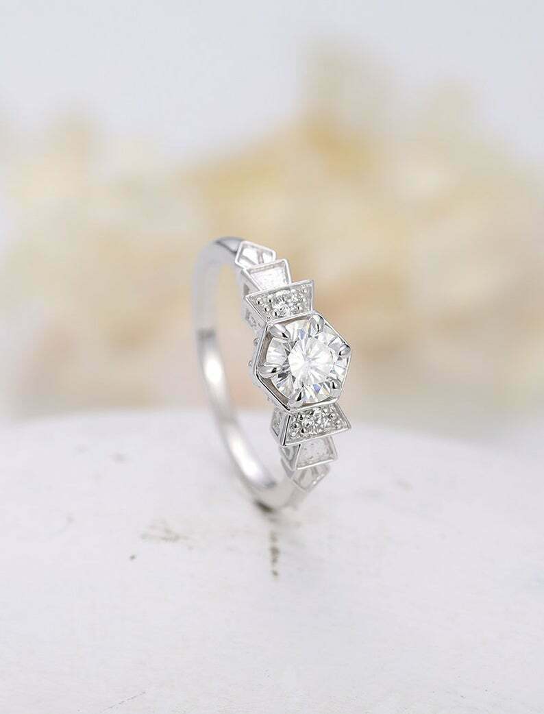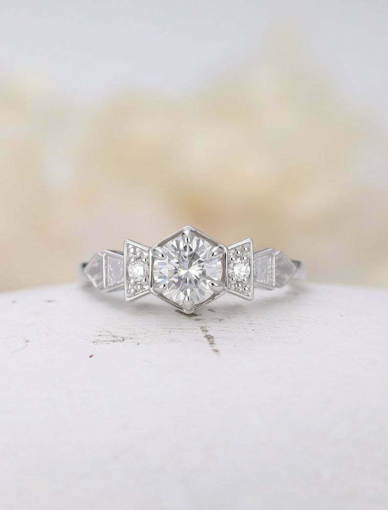 1.5ct Round Diamond Engagement Ring Hexagon Antique Inspired 14k White Gold Over