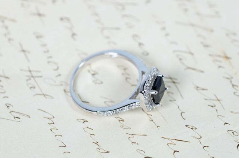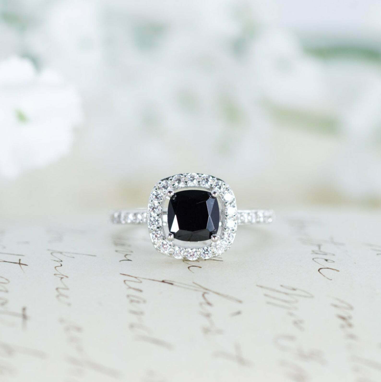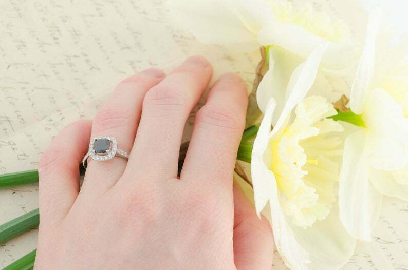 1.6ct Cushion Black Diamond Engagement Ring Halo Solitaire 14k White Gold Finish