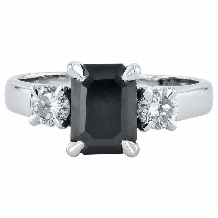 1.6ct Emerald Cut Black Diamond Engagement Ring Trilogy 14k White Gold Finish