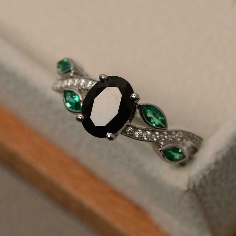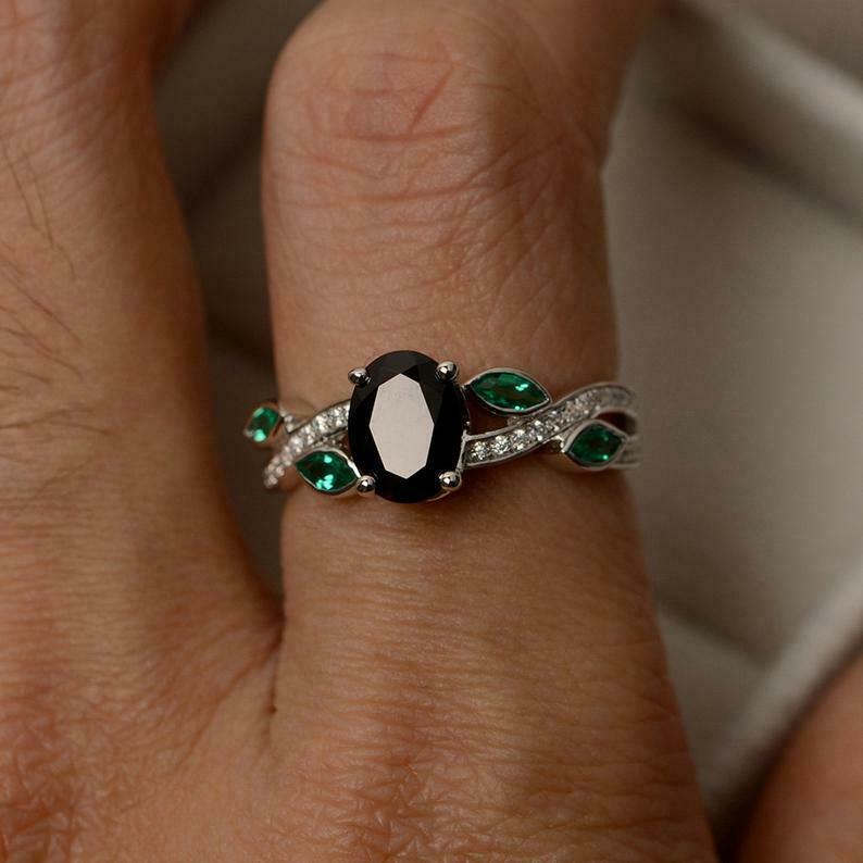 1.6ct Engagement Ring Oval Cut Black Diamond Leaf Accents 14k White Gold Finish