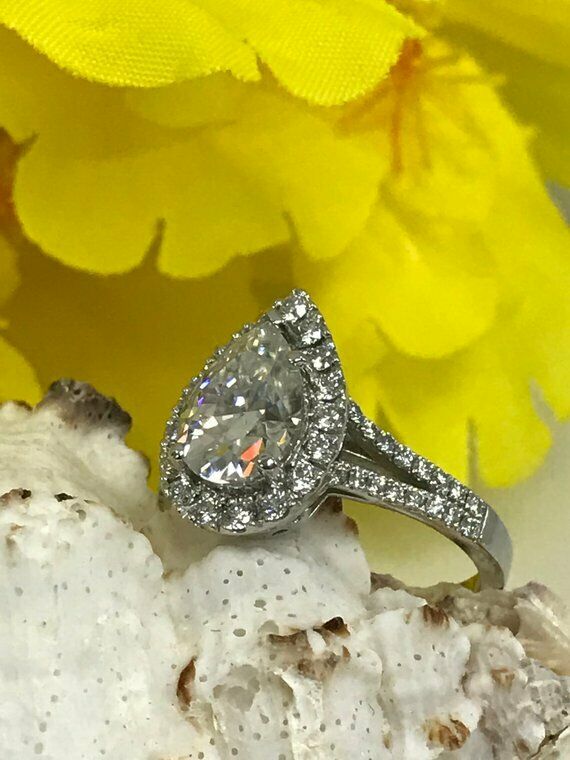 1.6ct Pear Cut Diamond Halo Split Shank Engagement Ring 14k White Gold Finish