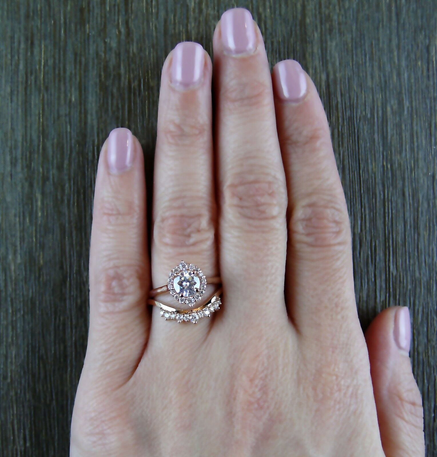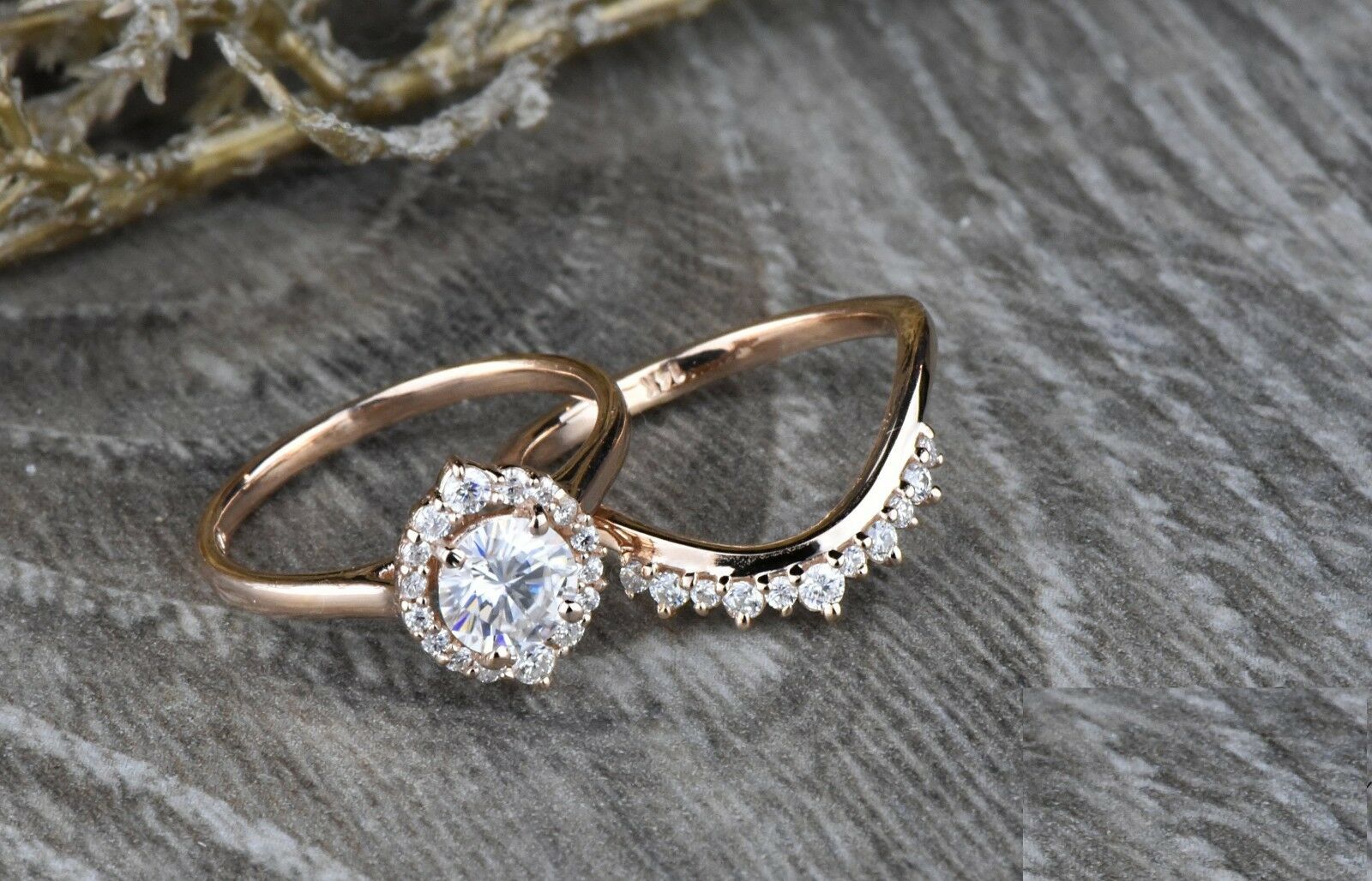 1.6ct Round Cut Diamond Engagement Ring 14k Rose Gold Over Halo Wedding Band Set