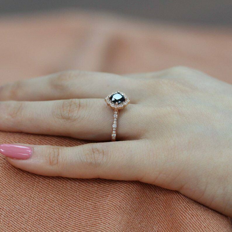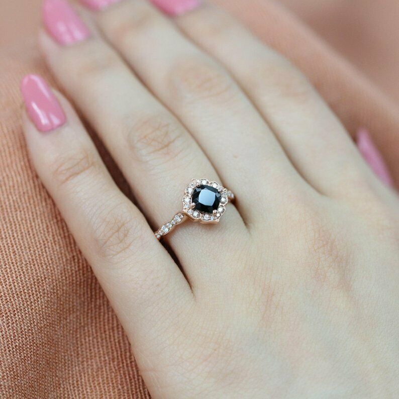 1.7ct Cushion Cut Black Diamond Engagement Ring Vintage Halo 14k Rose Gold Finish