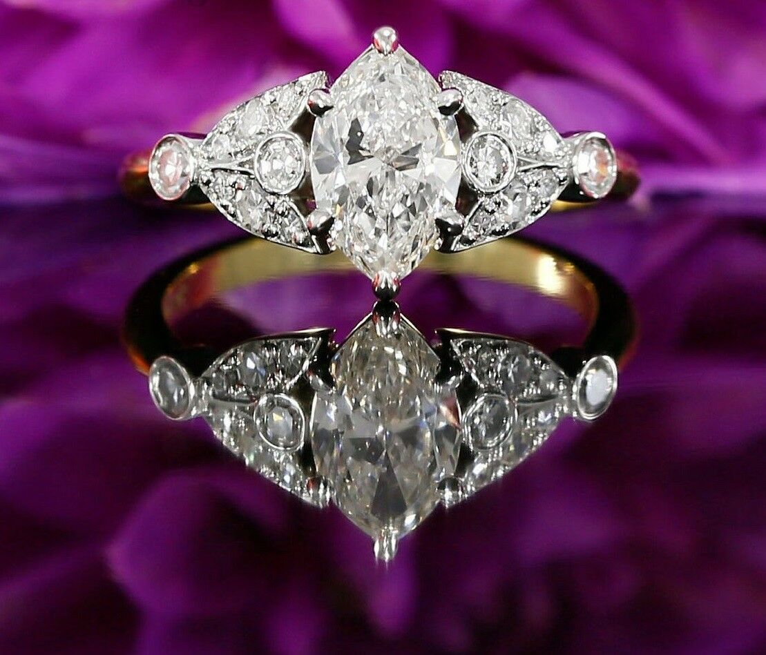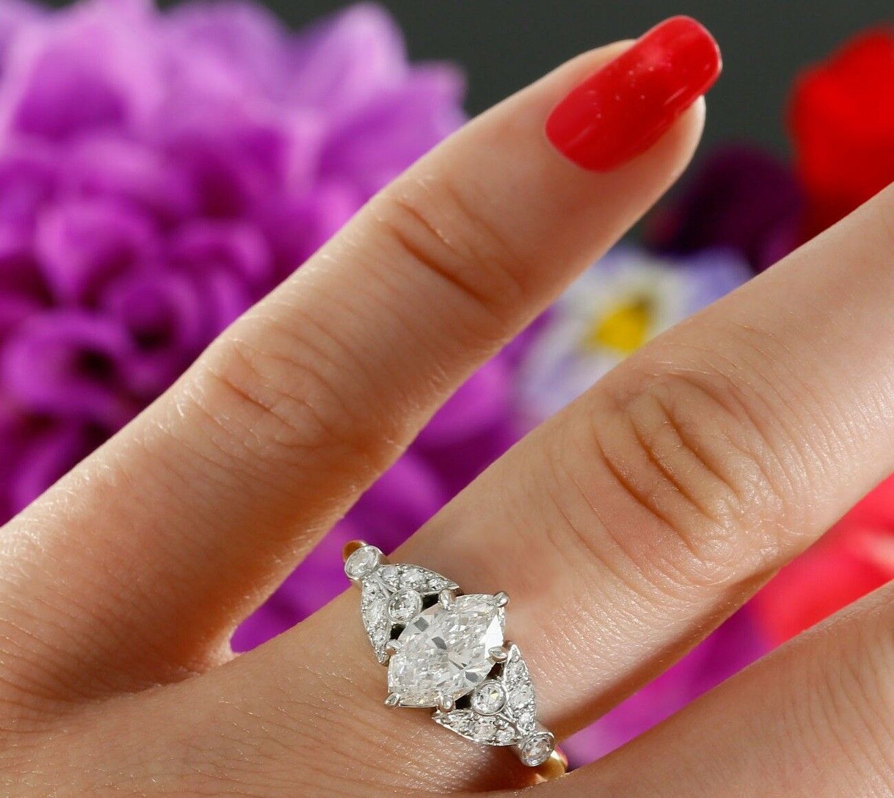 1.7ct Marquise Cut Diamond Floral Design Engagement Ring 14k Yellow Gold Finish