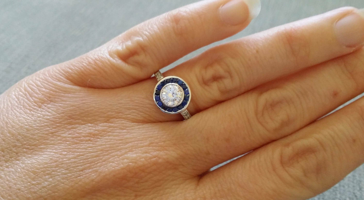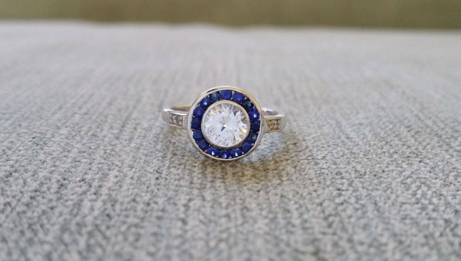 1.7Ct Round Cut Diamond Blue Sapphire Halo Engagement Ring 14K White Gold Finish