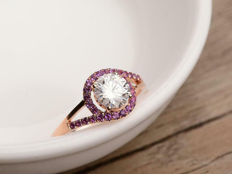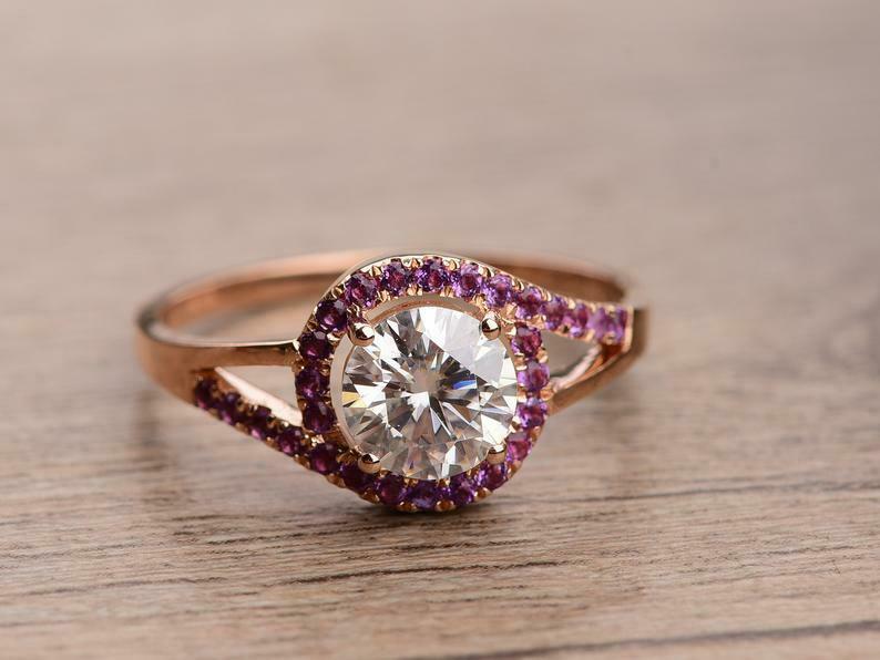 1.7ct Round Diamond Engagement Ring Split Shank Amethyst Halo 14k Rose Gold Over