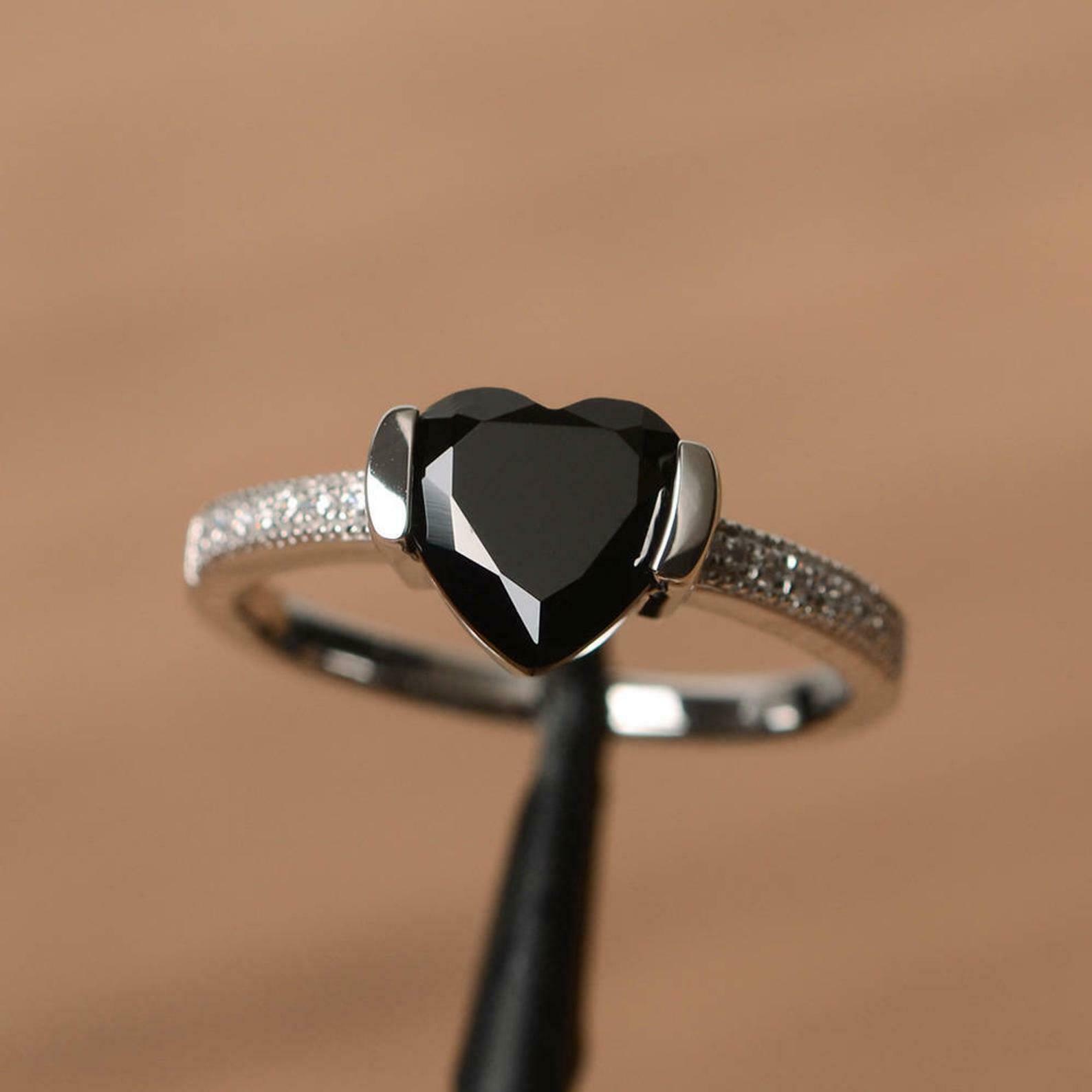 1ct Engagement Ring Heart Cut Black Diamond Solitaire with Round Accent 14k White Gold Over
